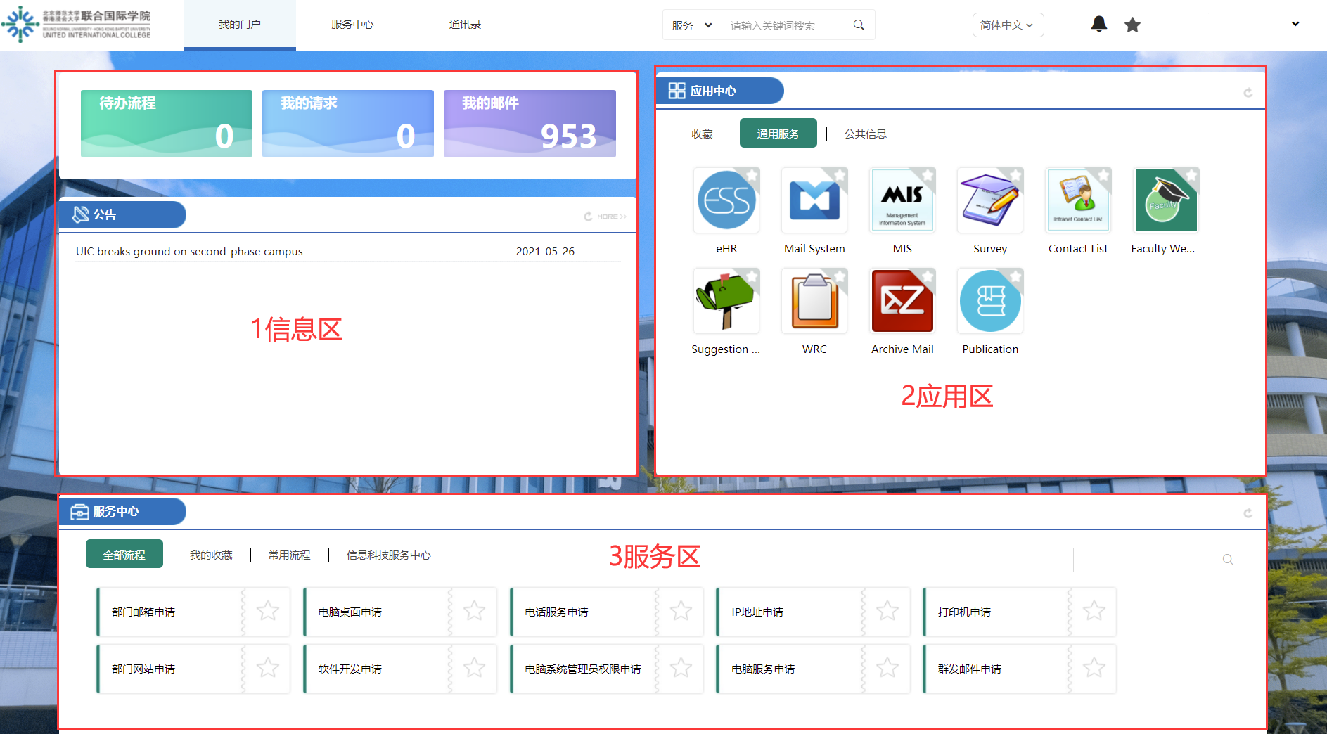 登陆后,用户会看到这样一个界面,主要分为3个区域,分别是左方的信息区域、右方的应用区域以及下方的服务区域。